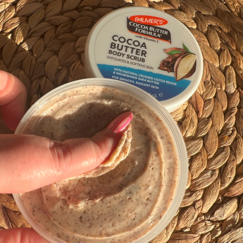 Уникална ексфолираща формула от Palmer's с чисто какаово масло обогатено с витамин Е, масло от шеа ( карите ), естествени черупки от какаови зърна спомагат за ексфолиране и полиране на кожата, като премахват мъртвите клетки на горния епидермален слой. Кожата става копринено мека и гладка, високото съдържание на какаово масло подхранва в дълбочина.