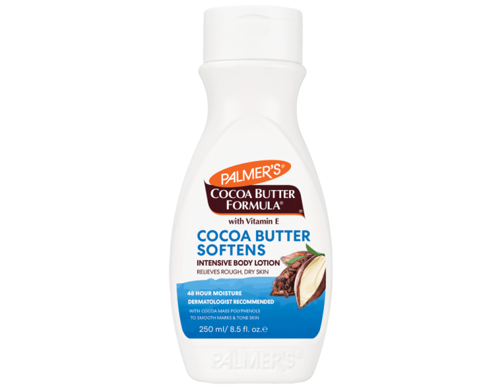 Лосион за тяло с какаово масло от Palmer's е създаден на базата на чисто какаово масло обогатено с витамин Е, подходящ за ежедневна употреба при суха и дехидратирана кожа. Най-новата подобрена интензивна формула за 48 часова хидратация, подхранва и овлажнява дори най-сухата и груба кожа. Висококонцентриран плътен лосион разтапящ се мигновенно, проникващ и попиващ в дълбочина с невероятен какаов аромат. Подходящ за изглаждане на несъваршенствата върху кожата предизвикани от стрии, белези, изглажда релефа на кожата. Придава мекота и гладкост веднага след нанасяне. Изключително подходящ за употреба за суха кожа предразположена към екзема, както и след излагане на слънце.