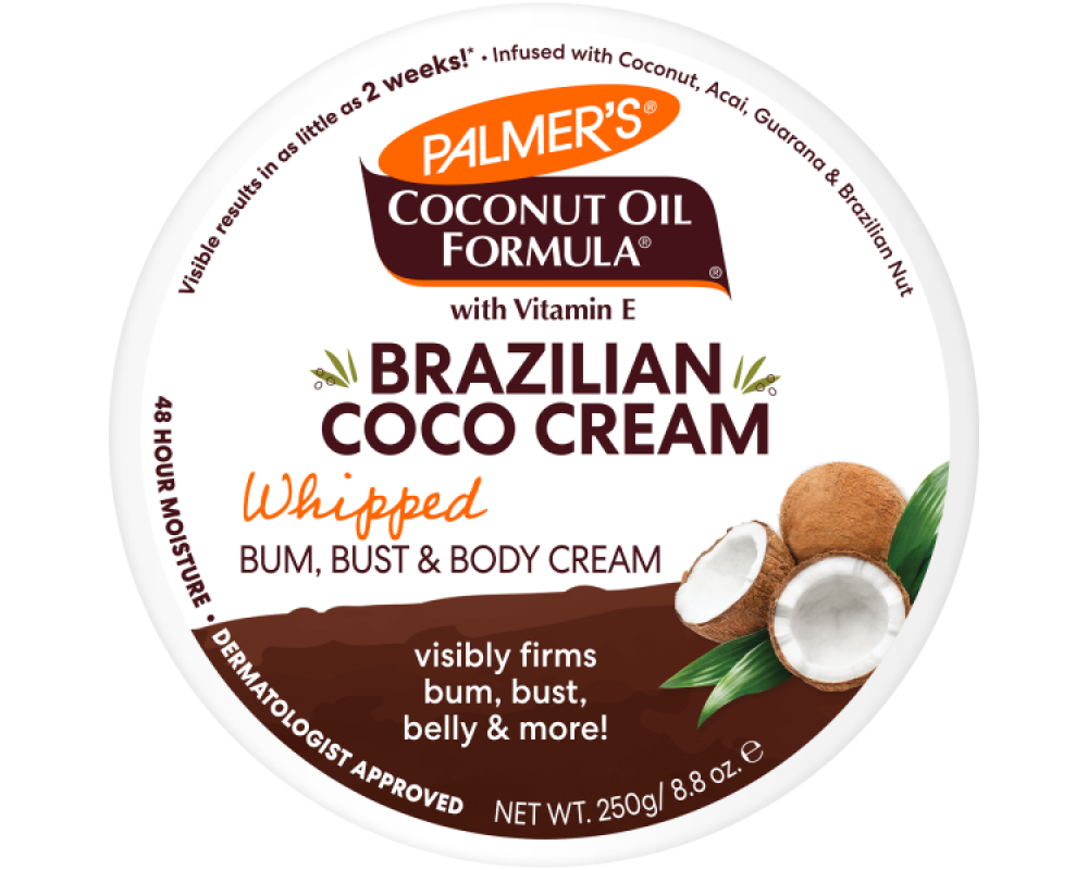 Бразилския кокосов крем Palmer's е създаден за видимо стягане и тонизиране на кожата в областта на дупето, бюста, корема, както и за цялото тяло с видими резултати за няколко седмици.Тази луксозна формула съчетава подхранващите ползи на кокосовото масло в комбинация с неповторими бразилски супер съставки на акай, гуарана и бразилски орех.