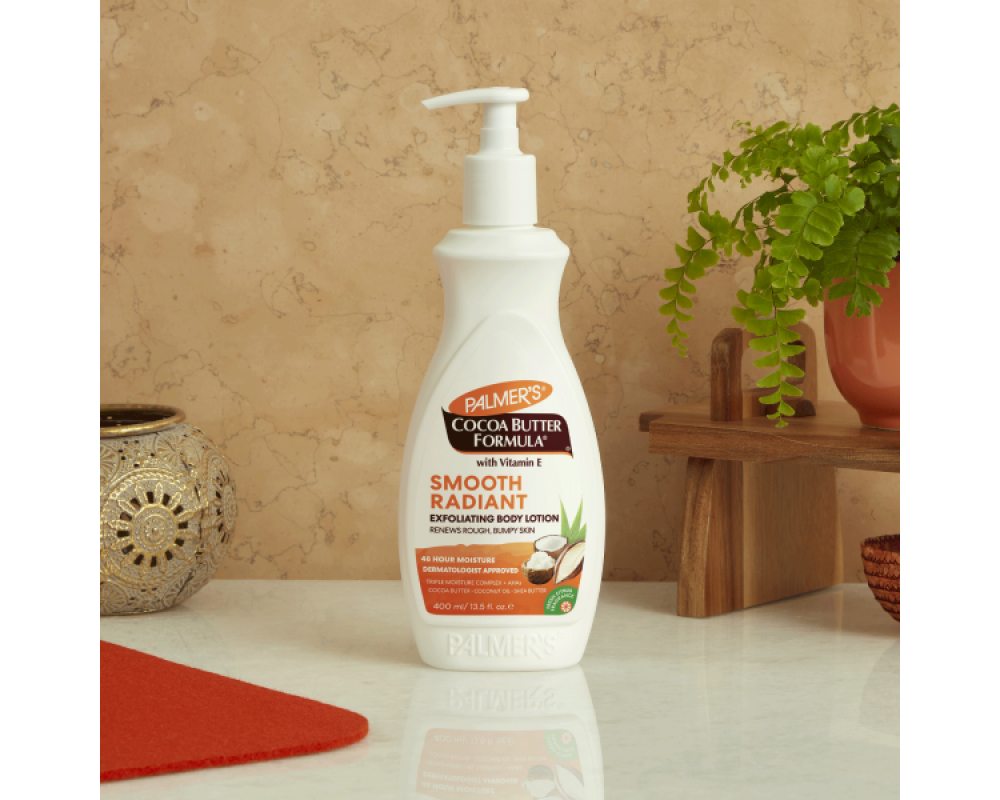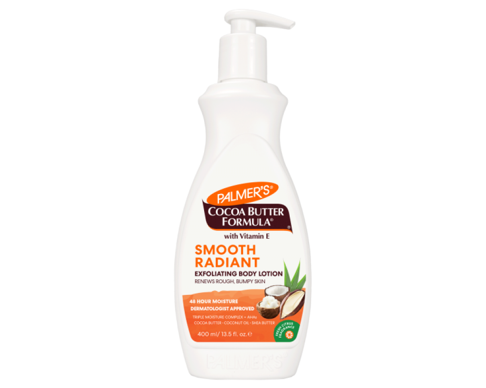 Изглаждащ и ексфолиращ лосион за тяло от Palmer’s е формула от тройна комбинация създадена на базата чисто какаово масло обогатено с витамин Е, кокосово масло и масло от шеа/карите/ за ексфолиране на мъртвите кожни клетки и изглаждане неравностите по кожата, за да поддържа кожата сияйна нежна и гладка. Какаовото масло прониква в дълбочина, като доставя ключови хранителни вещества в кожата. Кокосовото масло обогатява кожата с антиоксиданти и маслото от шеа/карите/ доставя неповторима хидратация на кожата за 48 часа. Висококонцентриран плътен лосион разтапящ се мигновенно, проникващ и попиващ в дълбочина.